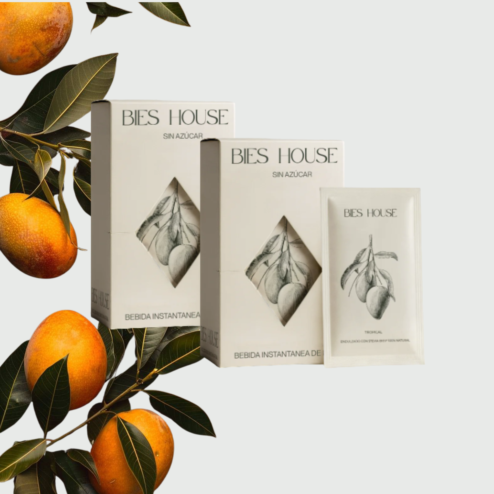 15 sobres monodosis de Bebida Instantánea Tropical con auténtico sabor tropical, endulzada con stevia 100% natural cultivada en España.