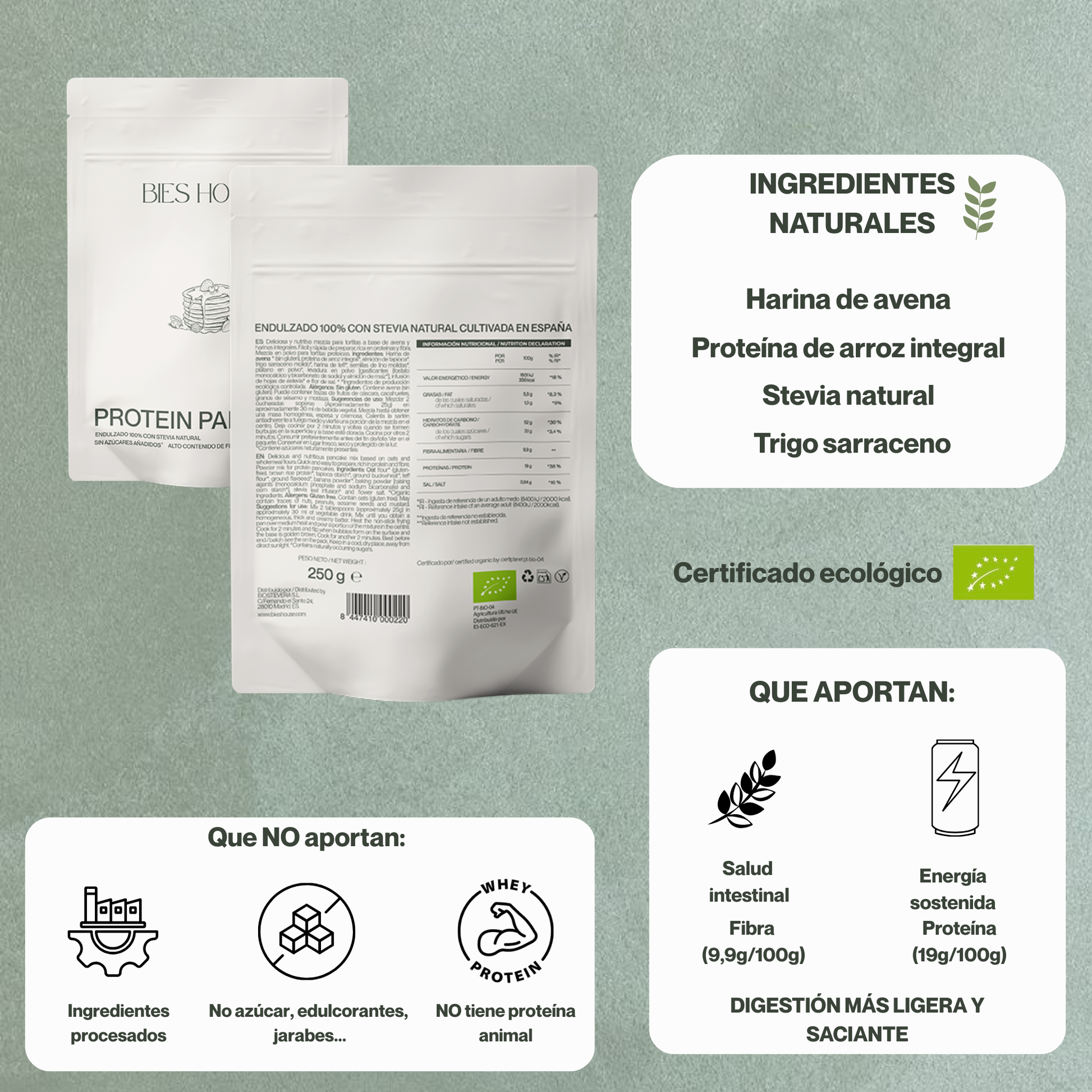 No. Las Tortitas de Proteína Bies House no contienen azúcares añadidos. Están endulzadas únicamente con stevia natural, manteniendo un perfil limpio y saludable.